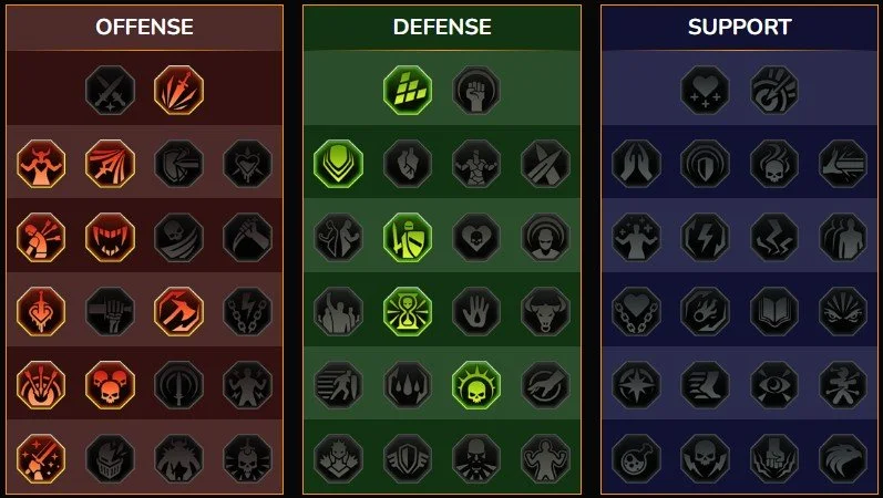 Offense — Deadly Precision, Keen Strike, Heart of Glory, Single Out, Life Drinker, Bring it Down, Cycle of Violence, Kill Streak, Methodical, Warmaster.
