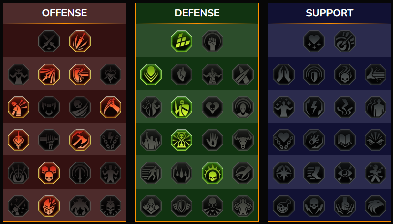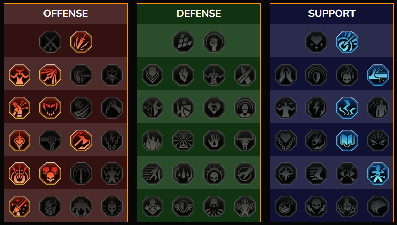 Offense — Deadly Precision, Keen Strike, Shield Breaker, Ruthless Ambush, Single Out, Bring it Down, Cycle of Violence, Kill Streak, Helmsmasher.