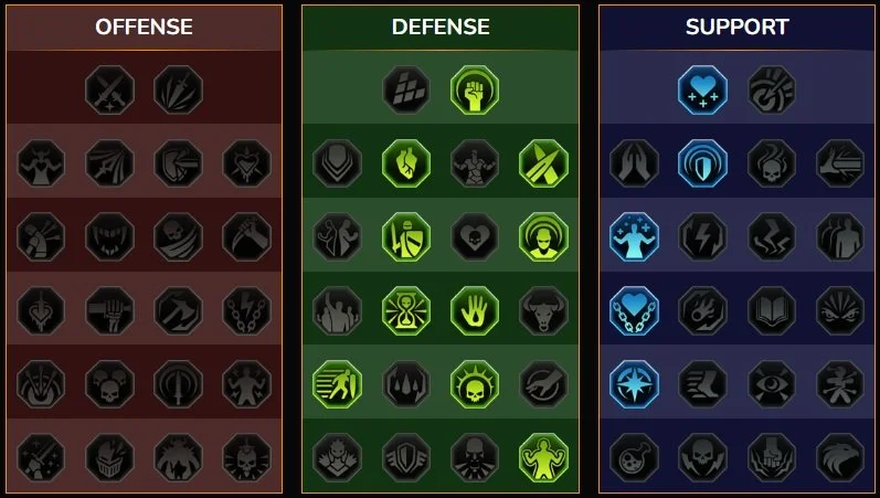 Defense — Defiant, Improved Parry, Wisdom of Battle, Rejuvenation, Resurgent, Delay Death, Harvest Despair, Retribution, Selfless Defender, Unshakeable.