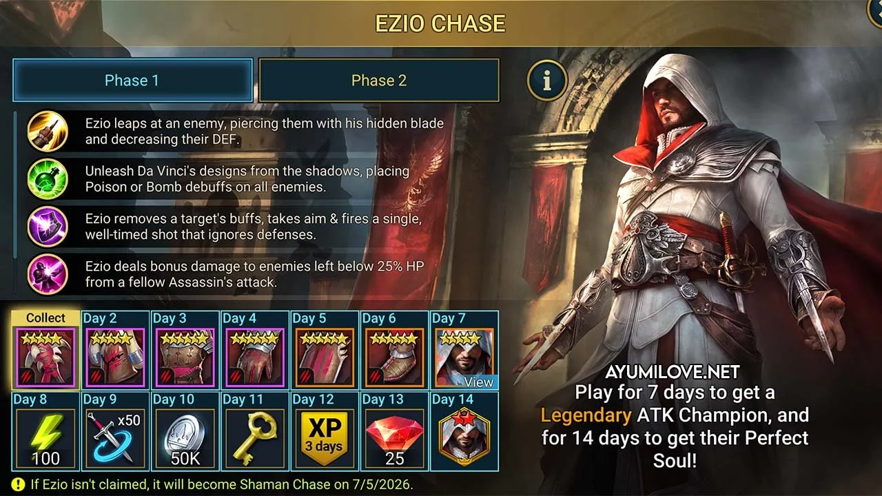 Phase 1 — 14 days check-in event, which gives Ezio on the 7th day and a 2-Star Perfect Soul on day 14.