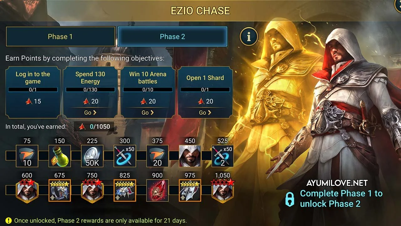 Phase 2 — 21 days Daily tasks to complete, that include a 5-Star Soul for Ezio, an avatar, a Primal Shard, and more.
